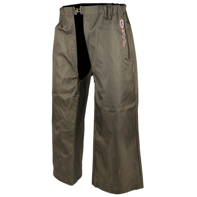 100% polyester anti-ronce imperméable.Cuissard antironce épais. Couleur vert. Tissu EVO, tramage croisé. Doublé sur l’avant anti-ronce. Ceinture élastique. 2 repose-mains zippés.