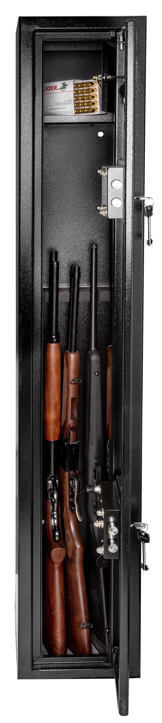 Porte mince équipée de 2 serrures à clefs actionnant directement les pennes. Intérieur des coffres peints en noir avec moquette grise au sol. Aménagements selon modèles. Coffre à munitions occupant le haut du coffre.